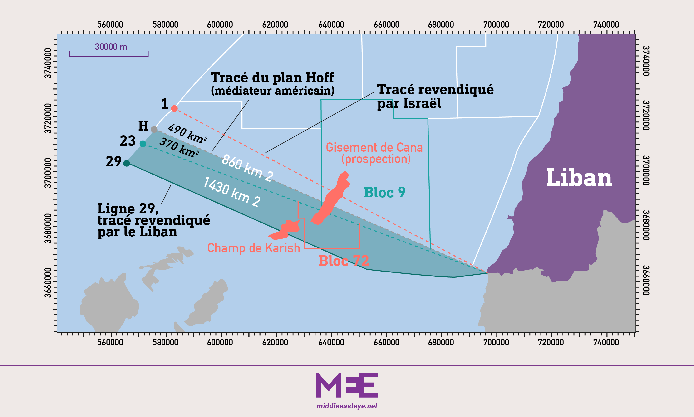 Bloc 9 : Il est situé au sud-ouest de l’embouchure du Litani, proche de la frontière maritime contestée avec Israël.